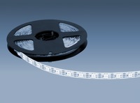 Flexible LED strip, equipped with individually addressable RGB LEDs, 18 W/m max., 60 LEDs/m, width 10 mm, length 5 m (one reel), dimmable, cutable at each LED, self-adhesive. Addressable with controller with pre-programmed special effects (e.g. LED flow lights), or with completely freely programmable controllers for individual special effects. Power supply by transformer 5 V DC