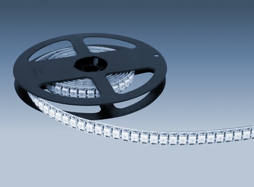 Flexible LED strip, equipped with individually addressable RGB LEDs, 43.2 W/m max., 144 LEDs/m, width 12 mm, length 2 m (one reel), dimmable, cutable at each LED, self-adhesive. Addressable with controller with pre-programmed special effects (e.g. LED flow lights), or with completely freely programmable controllers for individual special effects. Power supply by transformer 5 V DC