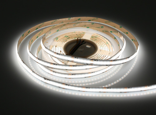 Flexible COB LED strip 21 W/m (840 chips/m), with RGB and white (RGBW), hereby the color temperature can be set from warm white to cool white (CCT adjustable, approx. 2800 K to 6500 K). Warm white and cool white are not created by RGB mixing, but by means of separate chips, resulting in a "clean" white without the color cast typical of RGB. Dot-free, beam angle 180°, CRI > 90, self-adhesive, width 12 mm, dimmable, length 5 m, cuttable each 35 mm. Max. brightness 1080 lm/m (RGB and white combined) or 340 lm/m (white only).