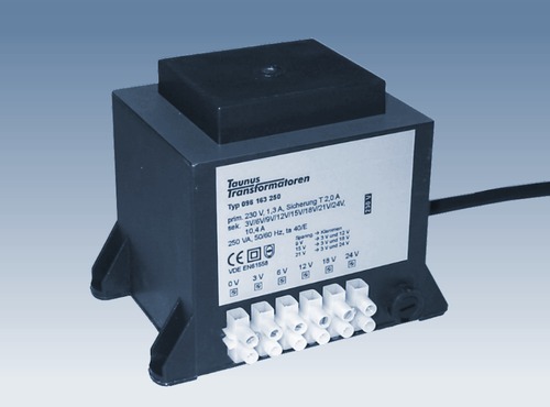 Voll vergossener Transformator mit mehreren Sekundärspannungen von 3 V bis 24 V, insg. max. 10 A, primär abgesichert