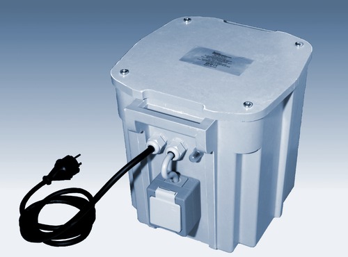Portable isolationtransformer 230 V, fibreglass reinforced enclosure, waterprotected IP54 (socket IP44), class 2. Suitable for supplying power tools up to 3500 W temporary load. Continuous nominal power 2100 VA
