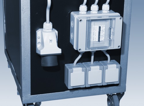 Input 3 x 400 V with 16 A-CEE plug. 3 outputs 230 V with 16 A Schuko socket (continuous nominal power 14.5 A each). Secondary automatic circuit breaker for each socket.
