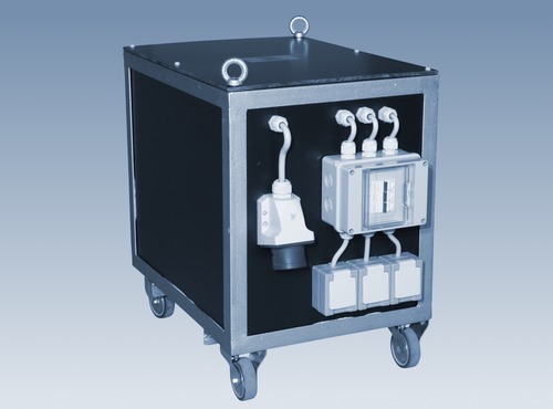 Mobile/movable isolating transformer for use on building sites or on revision works. Housing, IP54, class II, on castors, with transport lugs.
